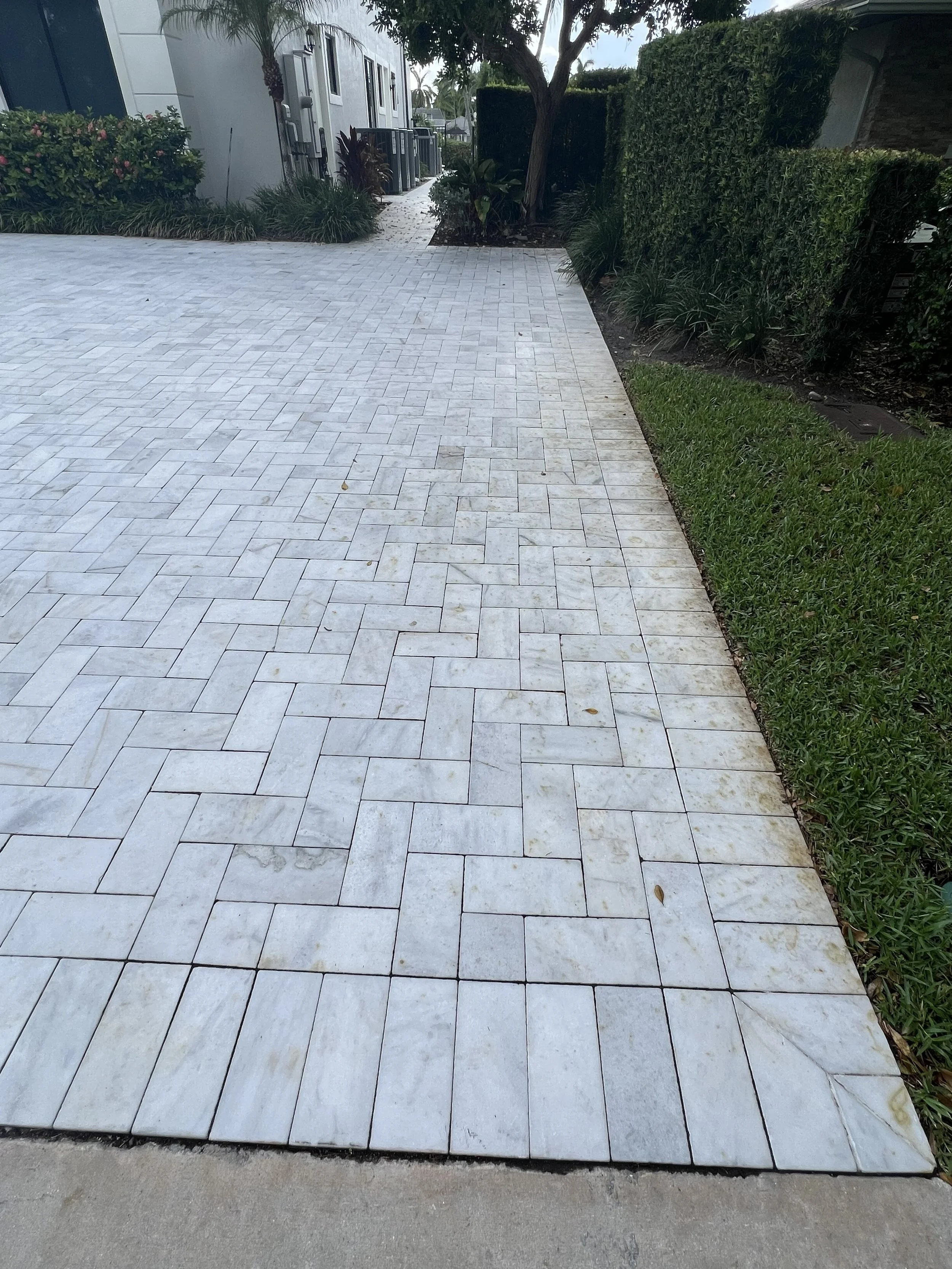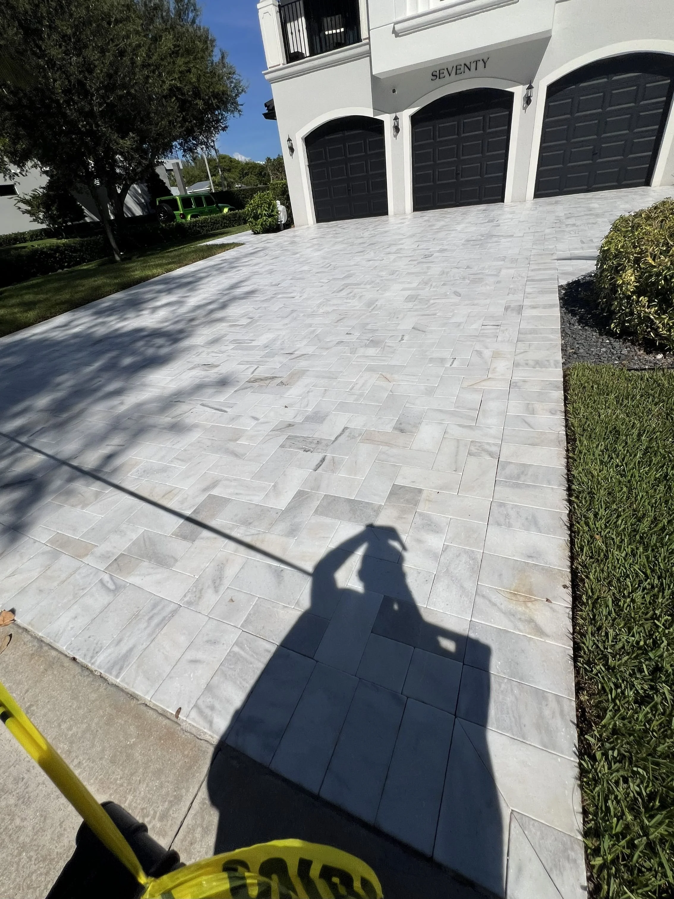 This travertine driveway in the prestigious Bay Colony neighborhood was steam cleaned to remove years of built-up dirt, mold, and grime. After cleaning, we treated rubber tire marks with acid and spot-treated leaf stains with bleach to restore the surface’s uniform color. Before completion, we applied our high-quality water-based sealer, providing lasting protection against Florida’s elements. The result: a bright, clean driveway that complements the elegance of this beautiful community.